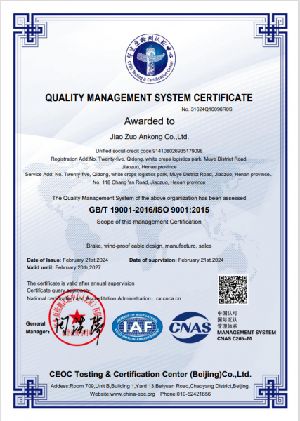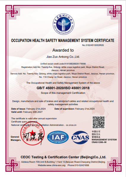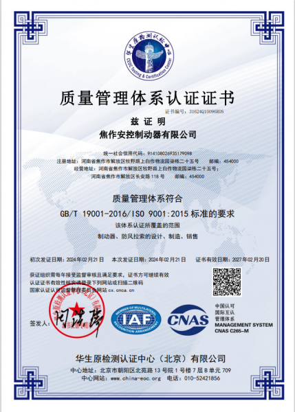 焦作安控制动器有限公司成立于2009年,坐落于河南省焦作市解放区牧野路上白作物流园柒栋二十五号,是一家集研发、生产、销售于一体的现代化制动器制造企业。公司注册商标:”安控“牌  公司专注于工业及港口机械设备制动领域,公司自主开发由SMS智能制动器、电动防风拉索、自动防风拉索,一键锚定、二合一轮边制动器等,公司并获得多项国家级发明专利,产品广泛应用于港口机械、起重机械、核电、水工、冶金等,以卓越品质和创新技术赢得国内外客户信赖。
